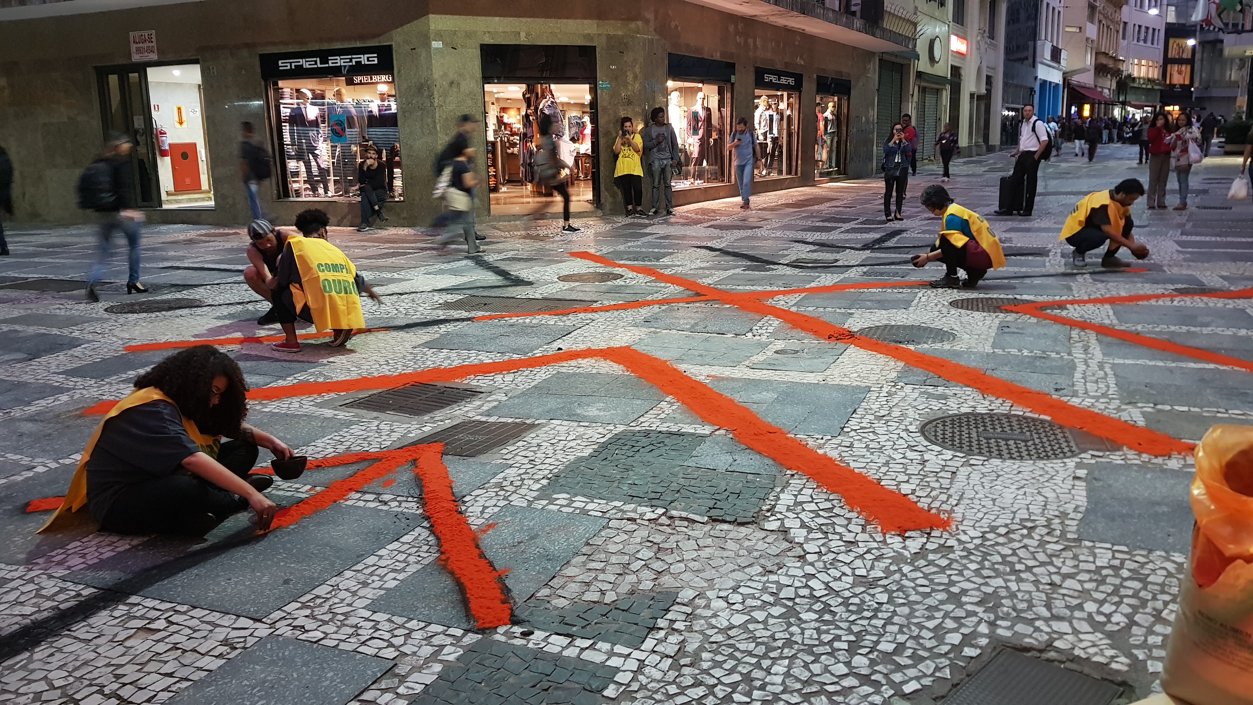 Consideradas manifestações típicas da cultura popular brasileira, as festas juninas foram disseminadas pelas tradições ibéricas e ressignificadas conforme cada região do país, culminando num processo que reflete as confluências culturais de diferentes contextos regionais. Embora haja diferenças entre símbolos, comidas e associações regionais, o evento realizado pelo Programa CCBB Educativo – Arte & Educação, dentro do Múltiplo Ancestral, não buscou se atrelar a uma forma específica, tampouco acentuar elementos “típicos”. Nosso intuito, por outro lado, foi suscitar a festividade como estratégia de ocupação do espaço público, entendendo-a como patrimônio cultural que atravessou a vida dos transeuntes que passavam pela rua da Quitanda em plena segunda-feira, dia 24 de Junho.